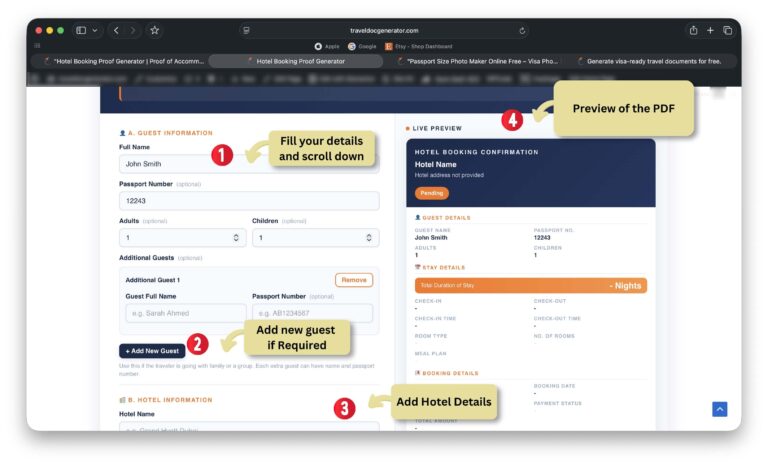Create a professional hotel booking proof or proof of accommodation document for visa applications, embassy submissions, travel planning, and personal reference. This tool helps you enter guest details, hotel details, booking information, and stay dates, then download a clean PDF instantly. Ideal for travelers, travel agents, and visa support use.